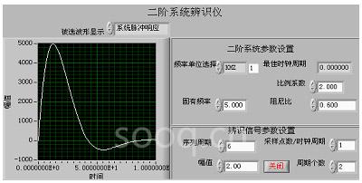 ![]() 图4 实验结果 3 实验结果 采用二阶系统辨识仪对系统进行辨识,系统模型参数设置为ξ=0.6,K=2,fh=5KHZ,经辨识后得到系统的脉冲响应如图(5)所示。 图中实线表示辨识所得系统脉冲响应。虚线表示系统脉冲响应的理论值。由此可见,采用虚拟仪器结合相关辨识法来辨识系统参数具有较高的精度。配合相应的数据采集设备,该辨识仪就能对实际电路参数进行辨识。而且根据系统参数的其它辨识方法(如最小二乘法、极大似然法、随机逼近法等),只要对软件重新设计,就能推广到系统辨识的其他领域。 |