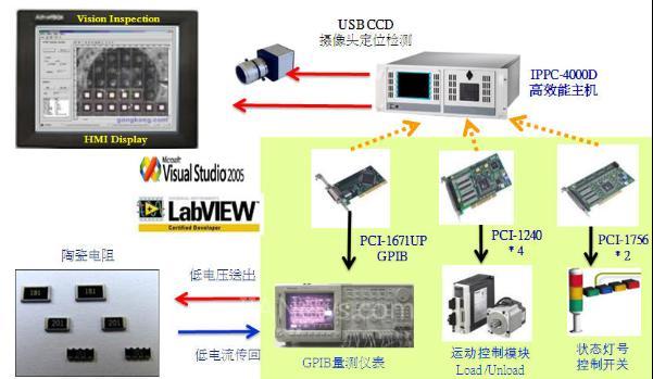 陶瓷电阻测试机的要求很高,需要支持多轴同步运动控制与海量数字量的监视与控制。客户要求整合GPIB仪表通讯接口与高端测试仪表,实现多样化的讯号读取,整合多种功能与实时控制的全套人机测试控制平台。同时,此系统还需具备Microsoft高效实时的开发软件作集成支持。