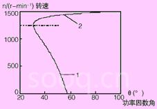由n=ns(1-s)及上式可得电机的功率因数角θ与电机转速n之间的函数关系θ=f(n),即可得出某4极三相电机函数关系曲线如图1所示。