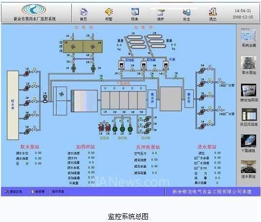 l 监测整个生产工艺流程和各细部的动态模拟图形。该系统实现了水厂整体工艺流程、各主要工艺设备运行状态、过程控制及各生产环节生产数据的实时采集与现实。主要流程画面有:取水泵房流程图、加矾间流程图、加氯间流程、反应沉淀池流程、V型滤池流程、公共冲洗泵房流程、送水泵房流程、10kV一次系统、低压系统等画面。实现的工艺生产设备监控功能有:所有被监控设备的运行状态、启停控制、设备与设备之间的连锁控制、工艺参数的设定,以及设备温度、电流、压力、液位、流量等参数的显示、报警、记录、趋势及累积量计算等。