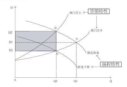 更直观的水泵(或风机)工作曲线图见图一:水泵(或风机)的正常工作点为A,当水量(或风量)需要从Q1调到Q2时,采用阀门调节,管网特性曲线由R1(阀门全开)改变为R2(阀门关小),其工作点调至B点,其功率为OQ2BH2’所围成的面积,其功率变化很小,而其效率却随之降低。当采用变频调速时,可以按需要升降电机转速,改变设备的性能曲线,图中从n1(额定转速)到n2(转速下降),其工作点调至C点,使其参数满足工艺要求,其功率为OQ2CH2所围成的面积,同时其效率曲线也随之平移,依然工作在高效区。