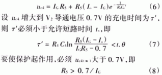 设电机负荷在额定状态下运行,电机电流I0已经稳定。电机短路或堵转后,电流突然增大到短路电流Is,电容C4开始充电。考虑一定的设计余量,取保护电流设定值IG。