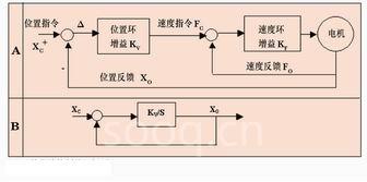为了简化讨论,同步系统中的控制装置可被简化为具有一个积分环节的位置系统,其框图如图3A所示。其中KV为简化後控制装置的位置控制器的开环增益,XC、XO为位置输入、输出;FC为速度指令,Δ为位置误差。KF为速度环增益,当KF》1时,可把速度环近似为1;於是该控制装置的开环增益变为KV/S,如图3B所示。