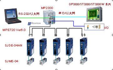 分将已成形的产品运送到指定的位置。控制系统采用安川运动控制器MP2300和Pro-face人机界面GP/ST3000系列,请见右侧系统图。
