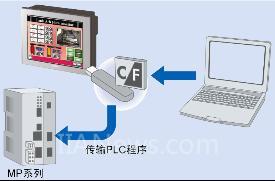 为了提高现场维护的便利性,Pro-face提供了不使用PC的情况下传输PLC程序的现场解决方案,维护人员可以不携带PC,将安川电机MP系列的PLC程序存储在CF卡或U盘中,带到现场直接插入Pro-face的GP/ST3000系列人机界面中,透过人机界面将PLC程序传输到MP系列中,参见图四。