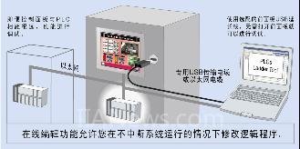 Pro-face的“穿越功能”(参看图五),可以实现通过GP/ST3000系列人机界面轻松调试PLC梯形图程序,从而实现了无论在任何地点都可以执行PLC调试的工作,以安川电机产品举例,现场使用Pro-face的GP/ST3000系列人机界面连接安川电机的MP2300系列控制器,工程师在办公室电脑上,通过以太网透过人机界面直接调试MP2300系列控制器的梯形图,从而可以实时调整因生产计划变化而需要