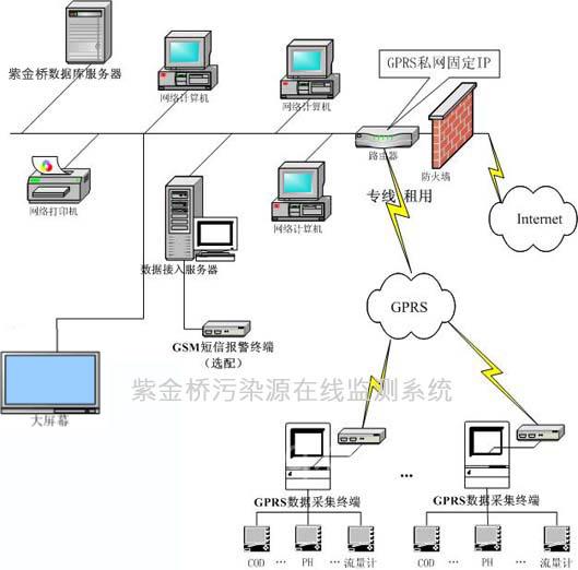 由于监测点分散,分布范围广,而且大多设置在环境较恶劣的地区,故利用GPRS无线网络进行无线数据传输。污染监测设备将采集到的污染数据和告警信息,通过GPRS网络,及时发送到环保监察部门,可以实现对排污单位或个人的及时管理,大大提高了工作效率,为环境保护提供了崭新方式。