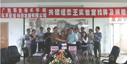 2009年5月20日,北京亚控科技发展有限公司校企合作计划走到广西南宁,与广西职业技术学院在该校会议室隆重举行了“共建组态王实验室”挂牌及捐赠仪式。广西职业技术学院副院长覃洪斌、电子工程机械系党总支书记李建春、系主任卢勇威、教研室主任覃贵礼等校方领导和亚控科技广州分公司经理韩结荣先生在仪式上就合作模式、未来发展以及高校毕业生所关注的就业与发展等问题进行了深入交流和探讨。