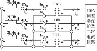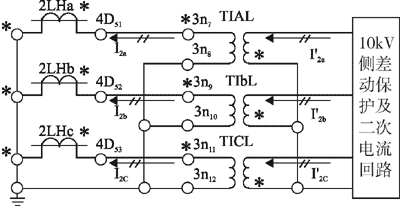 2.2 TA和电流变换器T1极性接线不对应主变35kV侧TA和差保电流变换器T1极性接线都为减极性,而10kV侧TA为加极性接线,但差保电流变换器却为减极性接线,由于两者极性不对应,如图3所示。