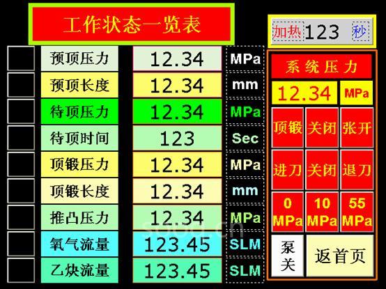 按下启动按钮,PLC中系统控制区画面编号寄存器(SNIR)将人机切换到“工作状态一览表”画面,见图2所示。油泵起动油压从0 Mpa升到预顶压强,将两段待焊钢轨对严,下一步自动地开启两个气体质量流量控制器,点燃加热器,摆火机构开始慢速