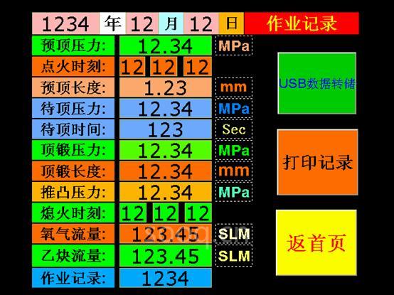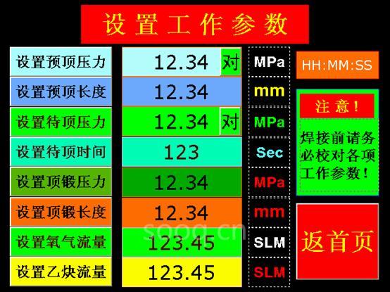 设置参数一共八项:①预顶压力 12.34 Mpa ;②待顶时间 123 Sec ;③待顶长度 12.34 mm ;④待顶压力 12.34 Mpa ;⑤顶锻长度 1.23 mm ;⑥顶锻压力 12.34 Mpa ;⑦氧气流量 123.45 SLM ;⑧乙炔流量 123.45 SLM ,如图4所示 。