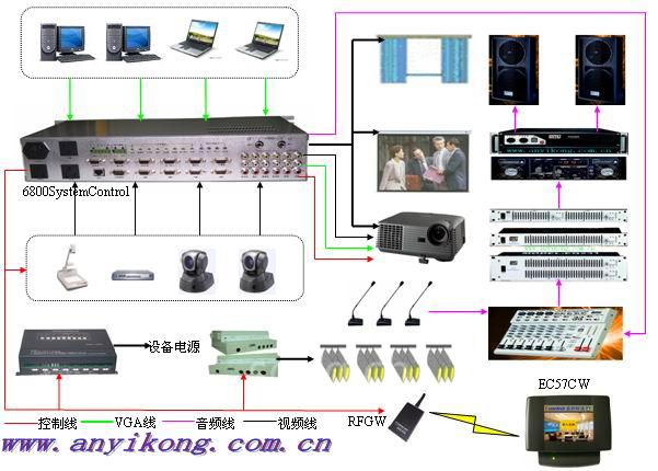 | 1 | 中控主机 | 易控YC6800 | 4*1分2VGA切换,4*1分2AV切换,4路RS232,8路IR,2路MIC,3路Power,2组继电器,2路I/O,数字音量调节输出 | 1台 |