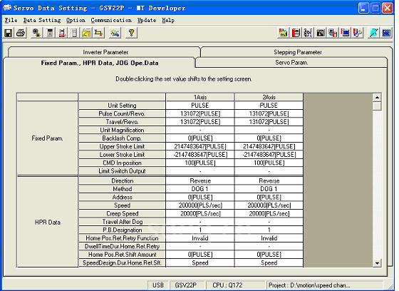 如果有必要,还可以根据需要进行共享参数设置,比如系统中有触摸屏时,就可以在触摸屏上设定指定轴的速度,通过共享参数刷新到运动控制器中去,再通过在运动控制器的CHGV中使用被刷新的新速度值存储软元件就可以改变指定轴的转速了,如果系统中有AD模块,也可以用外部模拟量来控制指定轴的转速。