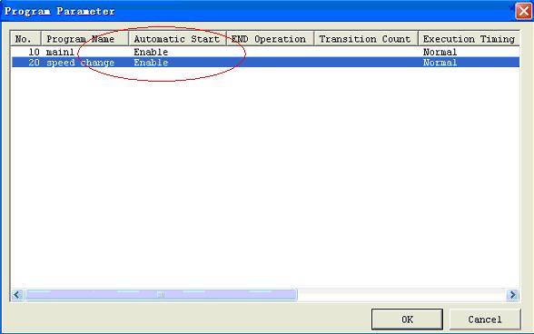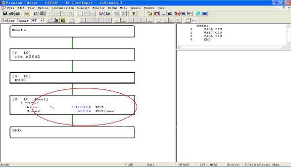 则上电运行后两个程序都被激活,如果此时将X0置为ON这可以启动main1的定位运动,在定位的过程中如果再将X1置为ON,则可将正在进行的定位运动的速度由65536PLS/sec改变成131072PLS/sec,速度提高一倍(新速度值也可以间接指定)。