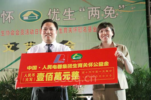 5月31日晚上,人民电器董事长郑元豹参加在柳市镇政府广场隆重举行的“生肓关怀、优生两免”大型文艺晚会,庆祝5.29计生协会活动日暨温州市设立首个“生育关怀冠名基金” 。郑元豹董事长代表人民电器集团为“基金”认捐100万元,用以支持、促进温州市计划生育扶贫奖励工作。