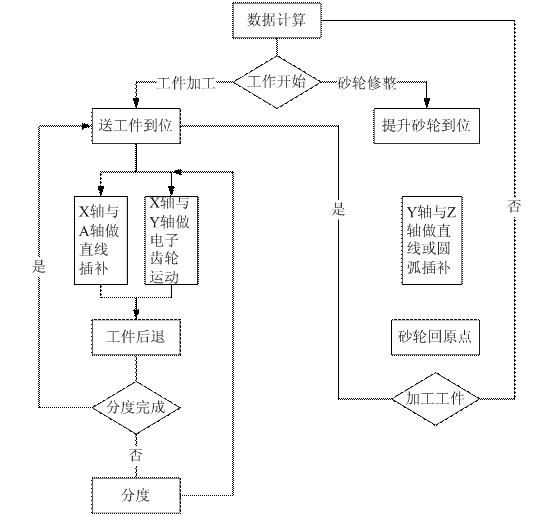 (2)修整砂轮功能:为了提高产品质量,不同的用户会将砂轮修整成不同的截面形状,该功能通过Y轴与Z轴的直线或圆弧插补实现该功能。
