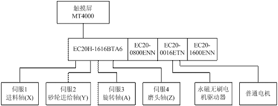 电控系统配置如图7所示:触摸屏HMI用于参数设定、设备状态显示等功能。伺服用于工作进给轴、旋转轴、砂轮进给轴、磨头轴的控制。永磁无刷电机用于控制磨头的转动。普通电机用于控制砂轮的转动。