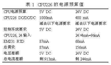 CPU 还向外提供一个24V 直流电源, 从电源输出点(L+,M) 引出。此电源可为CPU和扩展模块上的I/0 点供电,也为一些特殊或智能模块提供电源。电源预算值见表1。由表1 中数据可知: 电源容量完全满足要求, 无须增加外接电源。