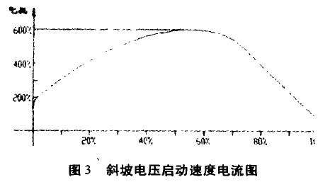 电压斜坡软启动器从零开始以线性斜坡增加电机端电压,直至额定电压。它是将传统的有级降压为无级,启动时间可调。这种启动方式缺点是启动转矩较小,转矩特性呈抛物线上升对拖动系统不利,且当电压斜坡升至额定电压时,如果电机仍未达到额定转速,电机将以全电压提供启动电流直至达到额定转速。见图1、图2。