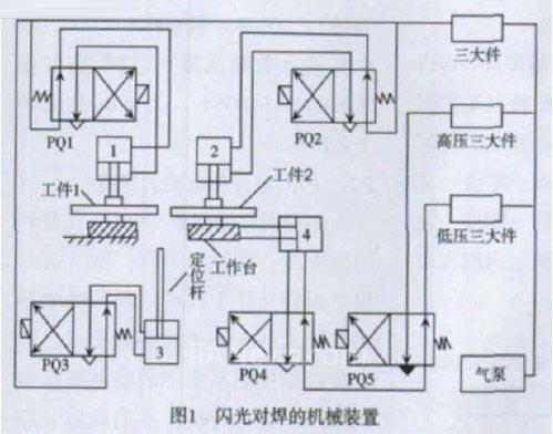 同时从气泵流出的气体经三大件进入定位气缸3的上气室,推动定位杆向上运动,为工件对准准确定位。定位结束,电图1 闪光对焊的机械装置磁阀PQ3线圈去电,定位杆弹回。