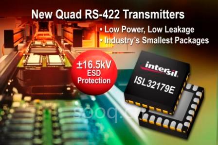 美国加州、MILPITAS — 2009年06月05日 — 全球高性能模拟半导体设计和制造领导厂商Intersil公司(纳斯达克全球精选市场交易代码:ISIL)今天宣布,开发出新系列的小占位、四端口、具有1.65kV ESD保护的RS-422收发器 --- ISL32179E、ISL32272E和ISL32274E。这些创新的器件具有宽电压操作范围,可用于马达控制、过程控制网络、远程通信产品和工厂自动化系统。
