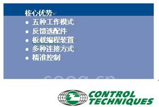 Control Techniques (简称CT) 是艾默生工业自动化的下属公司。我们的专项是驱动器的设计,生产和工程应用,并提供技术支持和售后服务.我们的目标是确保客户在使用了CT优良可靠的产品后, 能降低生产成本,提高生产效率.