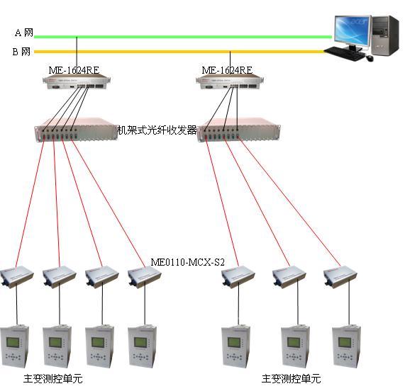 在设备选用上,甲方选择了ME0110-MCX-S2和ME0110-MCX-K两种,其中间隔层设备全用台式的ME0110-MCX-S2,控制室则全部使用集中插卡式的ME0110-MCX-K。控制室的插卡由一个2U机箱集中供电,2U机箱提供双电源输入,极大地保证了运行的安全性。