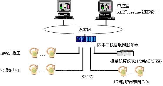 系统采用了RM 4000系列远端数据采集与控制模块,通过RS485串口数据通讯模式与串口设备服务器相连,并通过以太网将数据送至各台监控计算机。根据现场的实际工艺情况,由于两套锅炉系统总共需要大约四十多块RM400系列采集控制模块和流量积算仪表,且系统除了完成一般的数据采集任务还需实现锅炉实时控制输出。所以根据我公司工程经验,并鉴于RM采控模块和流量积算仪本身需分网联接,我们将这些模块和仪表分成四部分,分别为#1锅炉热工信号、#2锅炉热工信号、#1、2锅炉调节信号和#1、2锅炉流量积算信号,以确保快速的信号采集和控制输出速度。