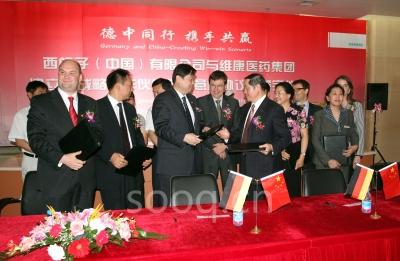 中国沈阳, 2009年6月15日,西门子(中国)有限公司和国内领先的民营医药企业——维康医药集团(“维康”)今日在沈阳签署了“关于建立战略合作伙伴关系的意向协议”,再次印证西门子致力于中国东北地区医疗事业发展的长期承诺。根据该战略合作协议,西门子将为维康提供富有竞争力的、创新的医疗产品和解决方案,旨在帮助维康提升其运营的医院的水平并改善东北地区的医疗服务。沈阳市铁西区常务副区长王一兵、西门子东北亚区首席执行官、西门子(中国)有限公司总裁兼首席执行官郝睿强博士及维康医药集团董事长刘忠臣出席签字仪式。