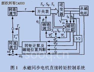 永磁同步电机控制系统框图如图1所示,采用直接转矩控制方法,这是19世纪80年代提出的交流电机高性能控制策略。本控制系统是一个速度和转矩的双闭环控制系统。系统利用电压、电流传感器检测直流母线电压Vdc。及定子二相电流i 和i ,通过坐标变换将定子三相坐标系中的电压、电流变量转换为α-β静止定子坐标系中的二相分量。将由磁链及转矩观测器得到的定子磁链、转矩实际值作为反馈量,与磁链、转矩给定值进行比较,所得到的误差信号通过磁链、转矩调节器的滞环控制单元后,获得0、1控制信号,再综合考虑当前定子磁链所在的区域,选择适当的电压空问矢量控制定子磁链的旋转速度及方向,即可直接快速地实现转矩调节。