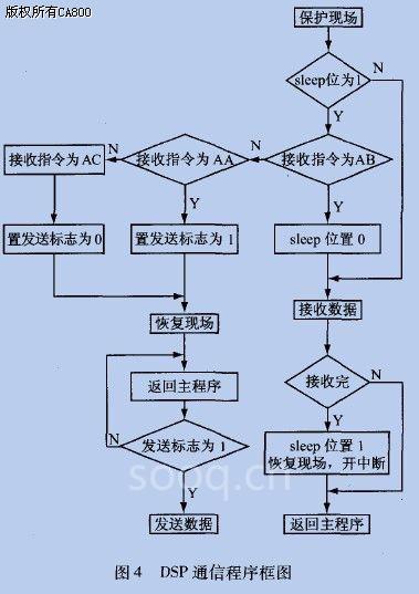 TMS320LF2407中包含一个串行通信模块(SCI),SCI的寄存器是8位的。可编程的SC1支持CPU和其他使用标准非归零(NRZ)格式的异步外设之间的串行数字通信,SCI的接收器和发送器是双缓冲的,每个都有它自己的独立使能和中断位。波特率可以通过一个16位的波特率选择寄存器进行编程 。为了保证串行通信的成功,在通信前必须对DSP的SCI模块进行初始化,设置通信的波特率、奇偶校验、停止位及每个字节包含的位数等,这些参数的设置必须与PC机上的设置一致,否则会引起传输错误。在DSP与PC机的通信中,对于DSP来说,通信的主要功能是接收Pc机传来的数据和发送数据给Pc机。可采用查询和中断两种方式接收数据,查询方式需要程序循环检测通信端口,浪费DSP资源,因此本系统接收数据时采用中断方式;但在发送数据时由于要发送的数据比较多,如果也用中断方式就会干扰到电机的控制,电机不能平稳运行,因此采用查询方式。在中断子程序中设置发送标志位,通过在主程序中查询该标志位来决定是否发送数据。在发送数据过程中,下位机需要发送多组数据,每组数据对应不同的电机参数,如何正确区分这些数据是通信能否成功的关键。本系统利用已设定的下位机发送参数的顺序、MSComm控件的inputlen属性及rthreshold属性的配合使用来解决这个问题。另外下位机接收和发送寄存器是8位的,需要设定标志变量来区分、合并高低字节。图4为下位机通信程序框图。