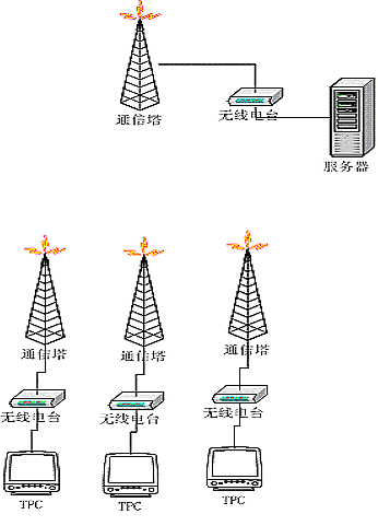 这里描述的主要是基于无线电台的无线通讯方案。在实际使用中,还可以考虑GPRS,无线网卡等方案。无线电台的优点是一次投资,无需运营费用,缺点是速率较低,还需要解决频点问题。