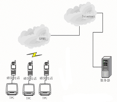 本方案中,TPC使用GPRS与Internet建立连接,连接时获得的IP地址是不固定的。服务器使用固定IP连接到Internet上,可以使用专线方式连接。在建立连接后,可以传送实时数据,历史数据和告警数据。