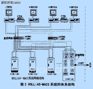 操作员站是人机对话的界面,几乎所有的控制指令和状态参数均在此交互。在操作员站上可以分别显示现场的各种工艺参数的测量值和软水站流程图、锅炉流程图、汽轮机的流程图、DCS系统组成框图、报警画面、操作日志等,有关参数和设备联锁的设置。并且可以显示某些重要参数的历史趋势图,定时和定点打印各种报表,操作简单,可以满足操作控制和生产管理的要求。图2为HOLLIAS MACS系统网络结构。