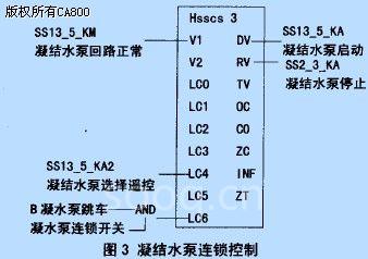 控制设备包括电动阀门:锅炉主蒸汽电动阀门、汽机主蒸汽电动阀门、汽机凝结水电动阀门、六台凝结水泵、三台循环水泵、三台电动齿轮油泵、三台直流油泵、三台汽轮机联锁电磁阀(发电机出口断路器)等,凝结水泵、循环水泵、直流油泵均为联锁控制。程序联锁框图见图3,其它设备联锁方法相同。