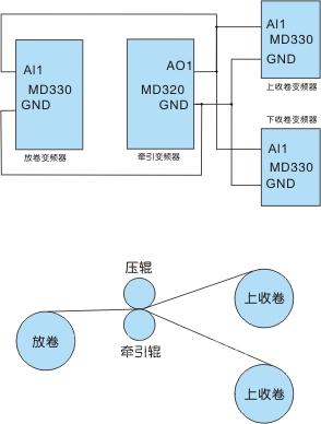 ■ 主机变频器使用汇川通用变频器MD320,控制分切机的运行速度,它工作在开环矢量方式下,主速度一般用电位器来调整,其AO1端口作为运行频率的输出,作为放卷变频器及上、下收卷变频器的线速度给定。放卷变频器及收卷变频器使用汇川MD330张力专用变频器,此三种变频器均工作在开环转矩模式下;