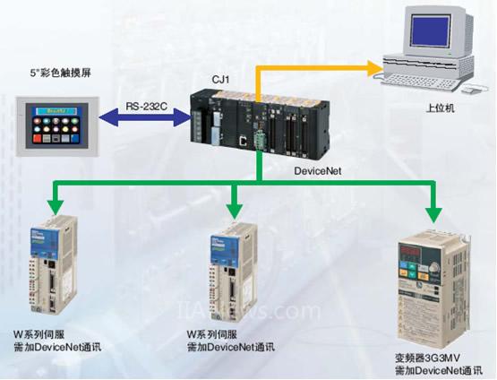 在丝桶往复控制系统上,我们选取了欧姆龙的中型PLC CJ1系列,采用DeviceNet现场总线作为控制系统。纵向、横向运动部件由欧姆龙的OMNUC W 系列AC伺服电机控制;变频器3G3MV控制出桶电机。系统还配有NS的触摸屏作为现场人机对话界面,并可根据用户需要通过以太网连接上位机。