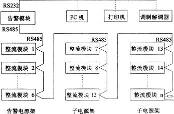 监控系统主要由告警模块,RS485和RS232通信接口以及整流模块内的单片机等组成。告警模块通过RS485通信接口与各个整流模块连接通信,以监控其运行情况。告警模块同时通过RS232通信接口与外设的PC机或终端机相互通信访问,并通过调制解调器实现“三遥”。