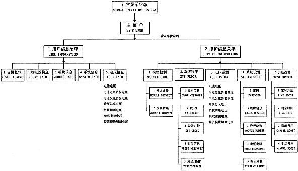 通过告警模块面板上的操作装置或接在RS232通信接口上的终端,采用菜单式操作方法,可以方便的实现对高频开关型整流器进行监控操作。该菜单包括用户信息菜单和维护信息菜单两大部分:用户信息菜单用于观察系统的参数及工作情况;维护信息菜单则用于观察和更改系统的工作参数。系统运行时,告警模块LCD显示屏显示系统市电电压,输出电压和电流以及电池电流。按[MENU]键,进入告警模块监控菜单系统,其系统监控菜单如图3所示。