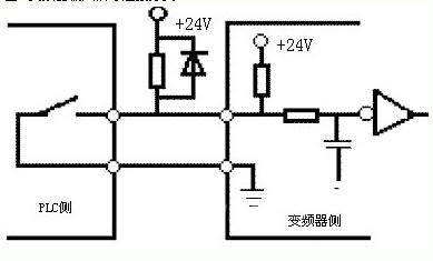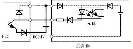 当输入开关信号进入变频器时,有时会发生外部电源和变频器控制电源(DC24V)之间的串扰。正确的连接是利用PLC电源,将外部晶体管的集电极经过二极管接到PLC。如图4所示。