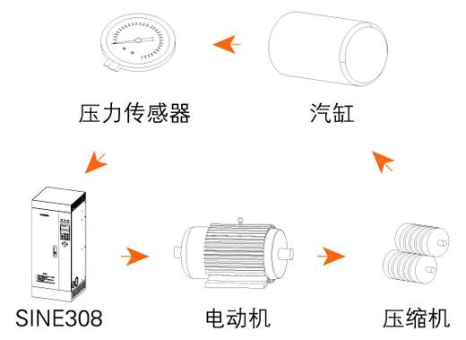 3、变频器根据压力传感器信号来控制电机频率,从而根据空气使用量来控制空压机状态。