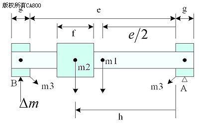 的恒定关系,则。即为负载动态调变增益。其中w只是一个比例值,可定义为1。设计w`只需要求得△m即可。如图3所示,定义长度e、f、g、h、及诸质量重心m1、m2、m3和a、b两点。利用力矩平衡原理可以计算出b点承受结构(含m1、m2)等效质量△m的大小。