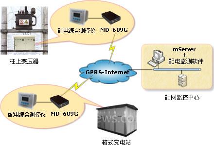 驿唐MD-609G GPRS DTU具有极高的性价比,并已通过电磁兼容相关实验,能很好的应用在电磁环境复杂的电力应用上,并成功应用于中低压配电及无功补偿等应用上,MD-609G具有标准RS-485/RS-232接口,可直接连接配电管理终端或配电综合测控仪,实现设备数据的无线传输,形成完整的无线配网监控系统。系统结构图如下: