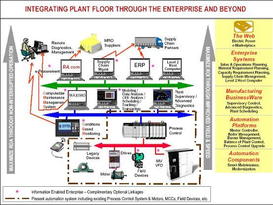 下面的结构图描述了罗克韦尔自动化对信息化企业的概念。褐色虚线内的区域表示本文中讨论的目前的自动化水平。其余部分说明了目前罗克韦尔自动化所能够提供的从车间到企业以及更高层次集成的诸多的解决方案。