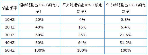 频率与恒转矩、平方转矩、立方转矩负载之间功率对照表