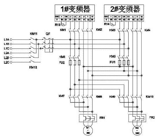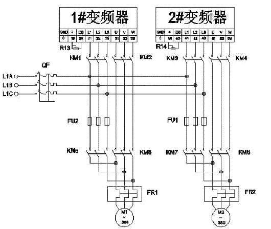 2、1#变频器只能带1#电动机,2#变频器只能带2#电动机,无法实现1#变频器带2#电动机、2#变频器带1#电动机工作方式,工作模式单一,灵活性较差,变频器利用率较低;