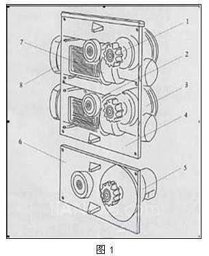 (1)齿轮 (2)导轮 (3)减速机 (4)减速机底板(5)锥鼓限速器 (6)限速器底板 (7)联轴器 (8)电动机