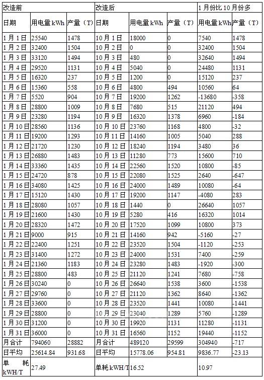 从上表可以看出,改造前的1月份与改造后的10月份,其单月产量差不多(10月份比1月份多产熟量717T),停窑时间都是6天,但1月份的用电量为794060kWH,10月份的用电量为489120kWH,1月份比10月份多用电304940kWH;1月份日平均用电量为25614kWH,10月份日平均用电量为15778kWH,1月份日平均用电量比10月份多9836kWH;1月份(高温风机)平均单位熟料电耗为27.49kWH/T,10月份为16.52kWH/T,1月份(高温风机)平均单耗比10月份多10.97 kWH/T。