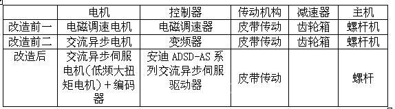 本方案是改造一台生产比较早的老式螺杆挤出机,1000多转的额定转速,却长期工作在100多转,电机性能达不到最佳状态,为了满足工况要求不得不加大电机选型增加了能耗。另外,效率也较低,造成很大的浪费,加工的产品质量也不高。而改造后,由于采用了低频大转矩电机与伺服控制器,使电机工作于最佳状况,不但降低了能耗,也提高了螺杆机的效率,提高了所加工的产品质量。