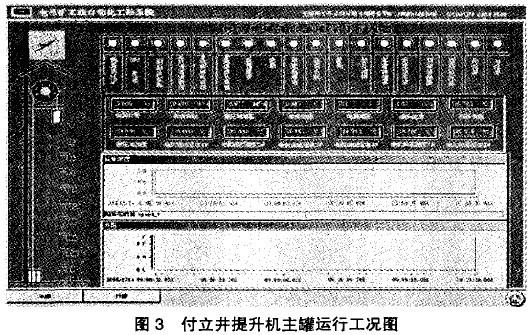 (2)提升机监控系统:对提升装置的电压、电流、油压、油温提升速度、位置以及罐笼总开停次数等重要运行参数进行监测发生故障及时记录。为调度人员及时维护和设备运行分析提供关键平台,见图3。